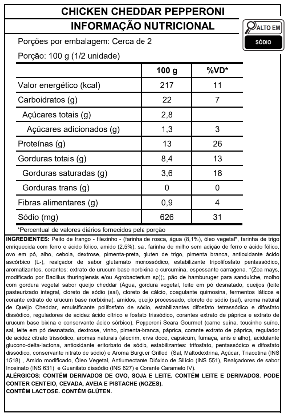 Duas tiras de frango feitas com 100% filezinho de frango, marinadas com lemon pepper e empanadas, acompanhadas de três fatias de Pepperoni Seara Gourmet e o nosso molho cremoso sabor cheddar, servidas em um pão macio e quentinho.