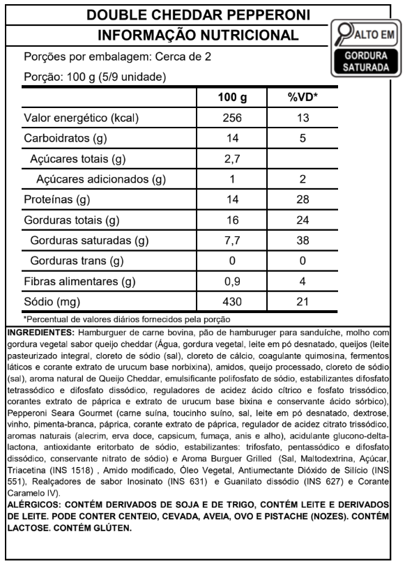 Dois hambúrgueres suculentos, acompanhados de três fatias de Pepperoni Seara Gourmet e molho cremoso sabor cheddar, tudo isso servido em um pão macio e quentinho.