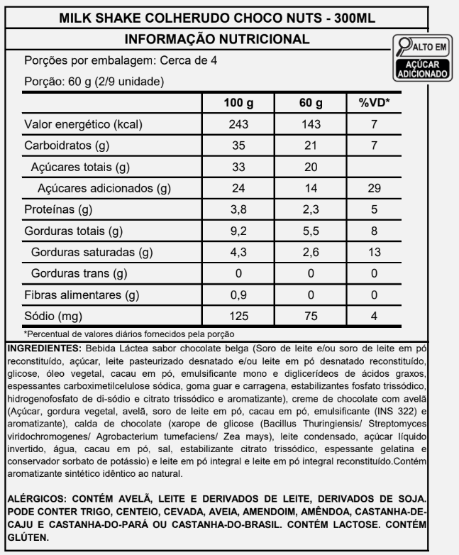 Para saborear de canudo ou de colher: Creme de chocolate com avelã espatulado nas bordas e paredes do copo, batido com a cremosidade da nossa bebida láctea sabor chocolate, calda de chocolate, finalizado com uma chuva de leite em pó.