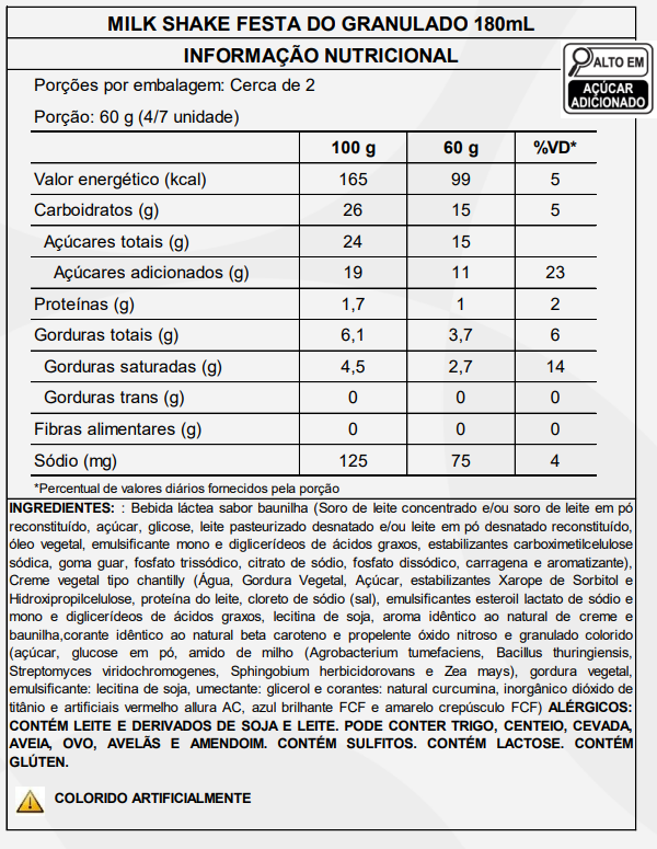 O nosso Milk Shake de 180 ml, combina baunilha gelada e granulados coloridos, batido na medida certa. No topo, chantilly fofinho (creme vegetal tipo chantilly) e uma chuva de granulados que transforma cada gole em uma verdadeira festa de granulados!